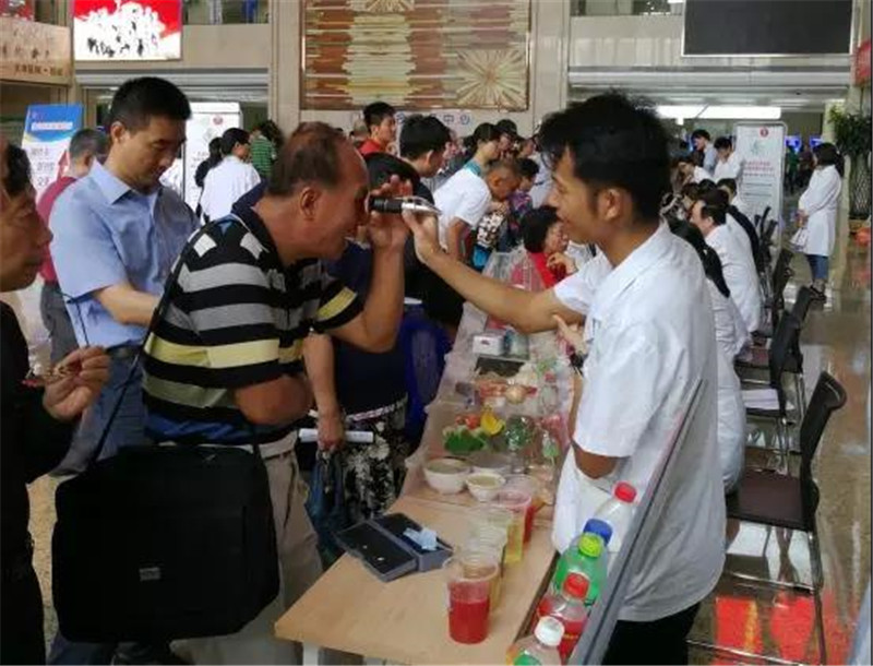 义诊期间为300余名前来咨询的群众做了人体成分分析并给给予报告解读;发放了大量营养宣传资料和运动卡片;还展示了膳食宝塔模型、饮料含糖量模型、食物含量模型、脂肪肝模型、腹型肥胖模型;另外营养科还准备了糖分测量仪,咨询者可自己测试出不同水果蔬菜果汁的含糖量,及用BMI尺大转盘测算体重是否肥胖等生动有趣的活动项目。