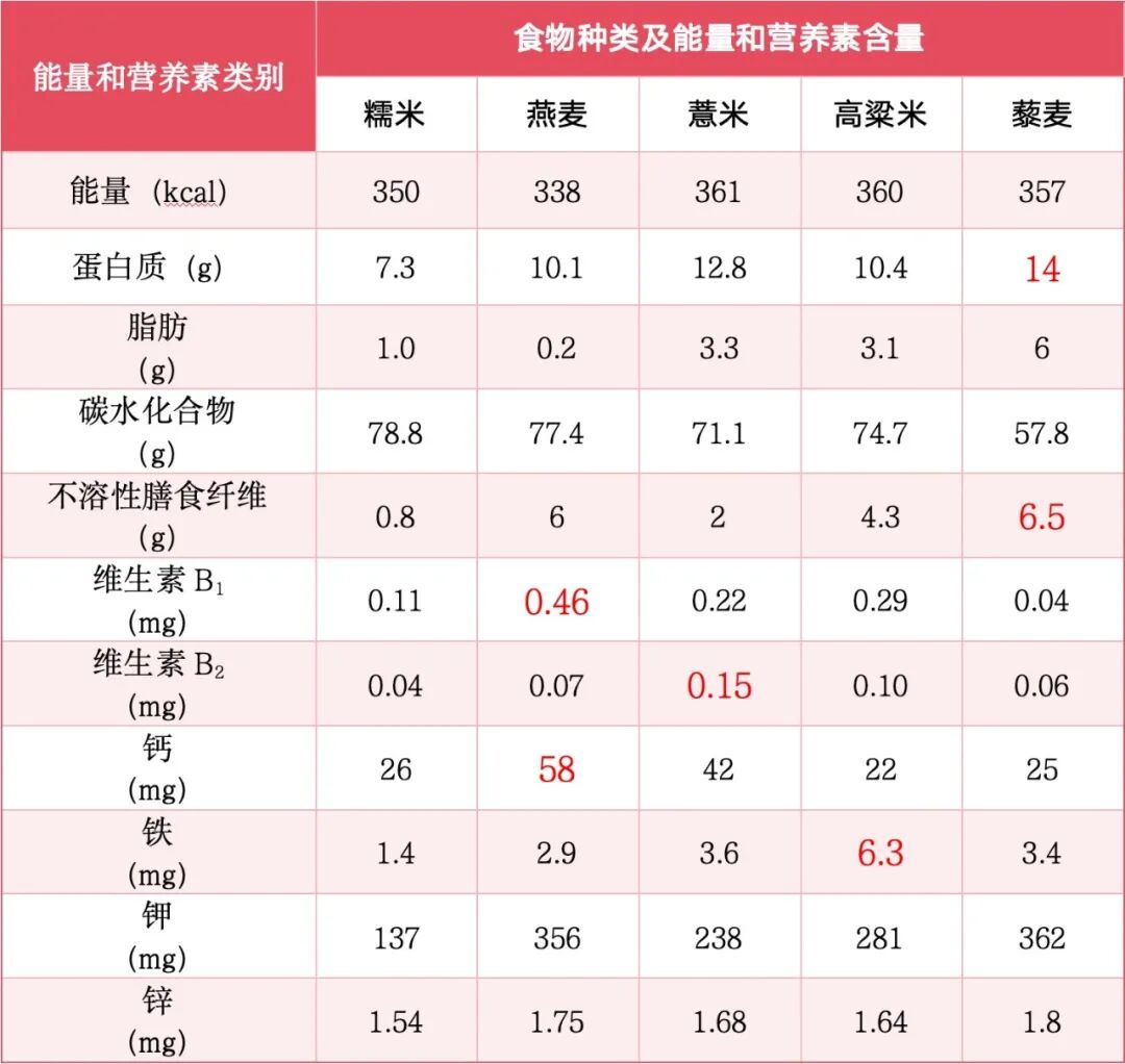 表1 腊八粥常见谷类的能量和营养素含量