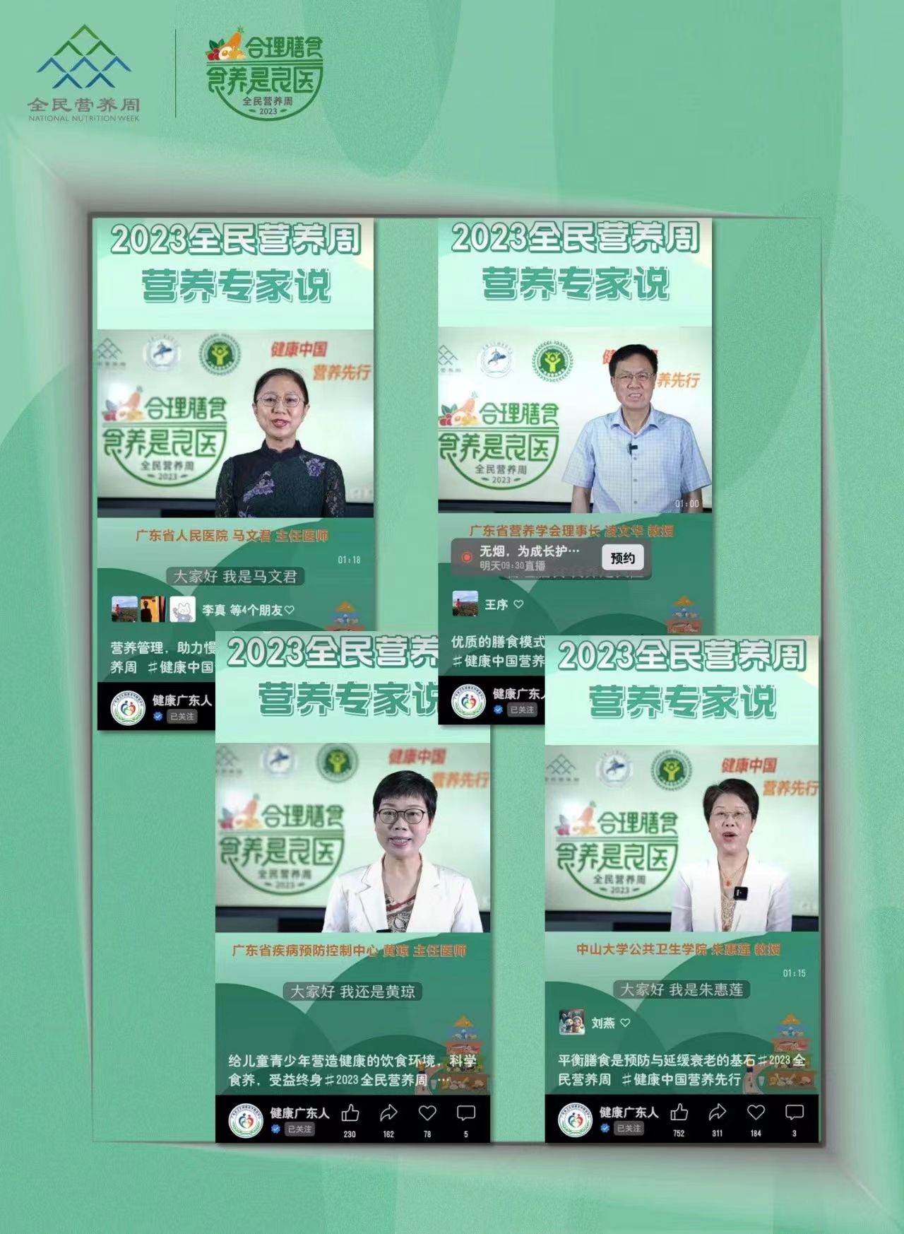 广东省卫生健康委组织4名营养专家(广东省营养学会理事长 凌文华 教授、中山大学公共卫生学院 朱惠莲 教授、广东省人民医院 马文君 主任医师、广东省疾病预防控制中心 黄琼 主任医师)拍摄的科普短视频在“健康广东人”视频号等平台播放,营养科普宣传覆盖非常广泛